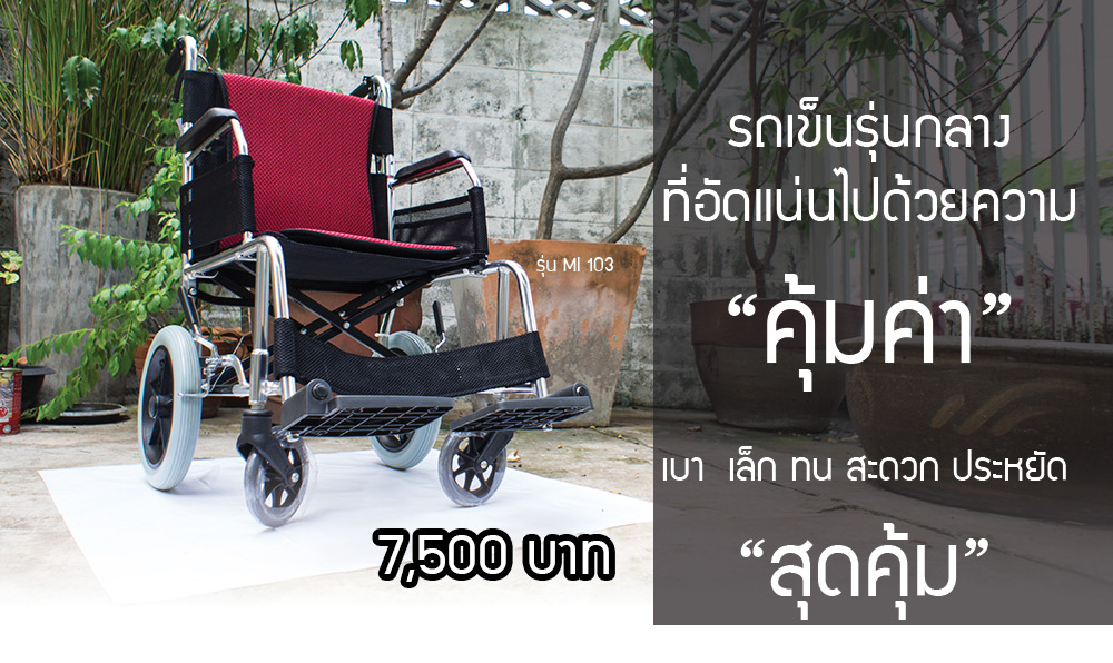 รุ่นนี้เหมาะสำหรับผู้ที่ต้องการความเบาพิเศษ ไทเทเนี่่ยมอัลลอยด์ อลูมีเนียมเกรดมาตรฐานญี่ปุ่นทำให้ตัวรถน้ำหนักเบาแต่แข็งแรง เบาะถอดซักได้ ทำจากผ้าตาข่ายโพลีเอสเตอร์รูปหกเหลี่ยมแบบเดียวกับที่ใช้ในรองเท้ากีฬาคุณภาพช่วยให้ระบายความร้อนไม่อับชื้น พิเศษเสริมลวดถักในผ้าตาข่ายไม่ต้องกลัวปัญหาเบาะหย่อนเพิ่มความทนทาน ระบายอากาศเป็นเยี่ยมที่สุด ล้อขนาดกลางไม่เล็กจนเกินไปทำให้เข็นขึ้นเนินง่ายไม่กลัวทางขรุขระ เหมาะทั้ง อินดอร์เอาท์ดอร์ ล้อเป็นยางตันไม่ต้อง คอยเติมลม ที่วางเท้าปรับระดับได้ให้เหมาะสมกับผู้ที่นั่งไม่ว่าจะขาสั้น หรือ ยาว ส่วนนี้สำคัญมากนะครับเพราะถ้าคนนั่งต้องนั่งงอเข่ามากจะนั่งไม่สบาย พับแล้วบรรทุกใส่ท้ายรถยนต์เล็กก็่ได้ รถใหญ่ติดถังแก๊สก็ใส่ได้ และยังขนสัมภาระได้อีกเพียบ มีเบรกมือสำหรับฉุกเฉิน มีกลไกมือให้คนนั่งล๊อกล้อได้เอง ถ้าเป็นคนแก่มากที่มีลูกหลานคอยเข็นให้ก็ควรใช้รุ่นนี้ครับ เพราะว่าจะใช้งานได้ สารพัดประโยชน์มากกว่า เหมาะสำหรับใช้งานที่บ้าน และเดินทางไปทุกที่ไม่เกะกะ ความพิเศษรุ่นนี้คือ น้ำหนักเบาพิเศษ เบาะฟองน้ำถอดซักได้ ที่วางเท้าปรับระดับได้ ก่อนเลือก วิวแชร์ทุกครั้งควรคำนึงถึงสุขภาพและความสบายของผู้นั่งเป็นสำคัญนะครับ *น้ำหนักของวีลแชร์มีตัวแปรสำคัญขึ้นอยู่กับยางที่่ใช้และวงล้อนะครับ อย่างรุ่นนี้เราใช้ยางตันและล้อแมกซ์ น้ำหนักจึง อยู่ที่ 9.8 กก. ภ้าเปลี่ยนเป็นยางสูบลมและล้อซี่ลวด น้ำหนักจะเหลือเพียง 8.3 kg ถือว่า เป็นรถวีลแชร์ไซต์มาตรฐานที่น้ำหนักเบาสุดๆแล้วครับ หมายเหตุ ยางตัน เปลี่ยนเป็นยางรุ่นใหม่ตามรูป รีวิว 360 องศานะครับ เพิ่มดอกยาง เป็นยางเกรดพรีเมี่ยม กันกระเทือนได้ดีอายุงานยาวนานกว่ายางทั่วไป "อยากให้คนไทยพาผู้สูงอายุในบ้าน ไปเที่ยวกันเยอะท่านจะได้ไม่เหงาเราก็ได้ตอบแทนท่านบ้าง"